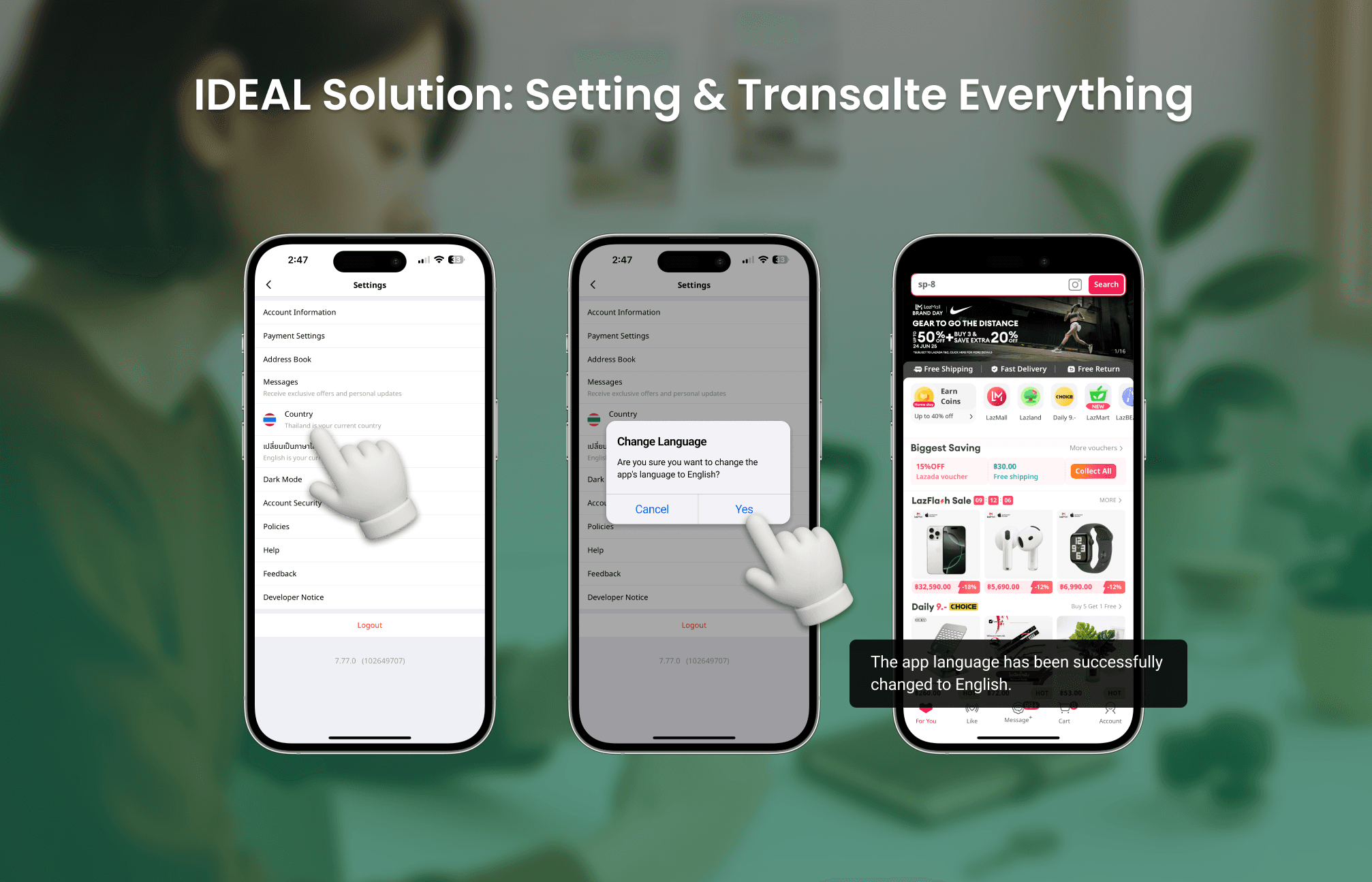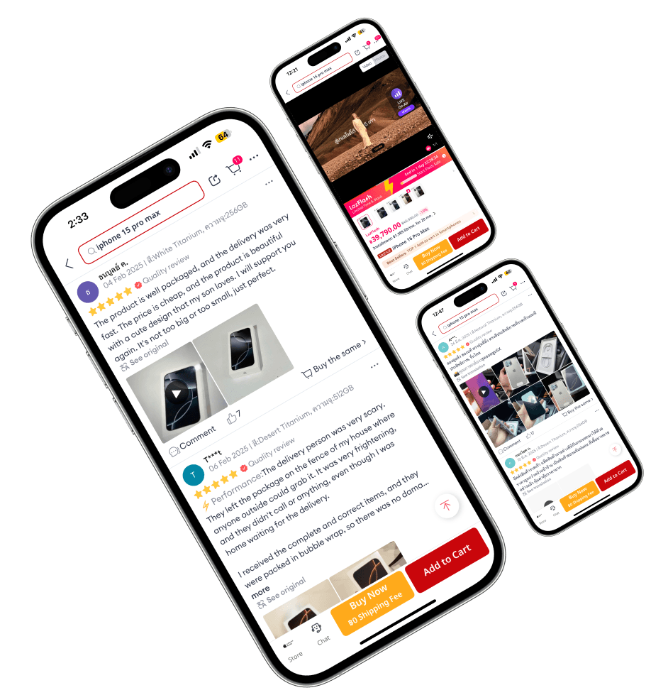 Most Lazada Thailand reviews are in Thai, creating a trust barrier for expat users. We designed a one-tap translation feature to help them read reviews easily and shop with confidence.